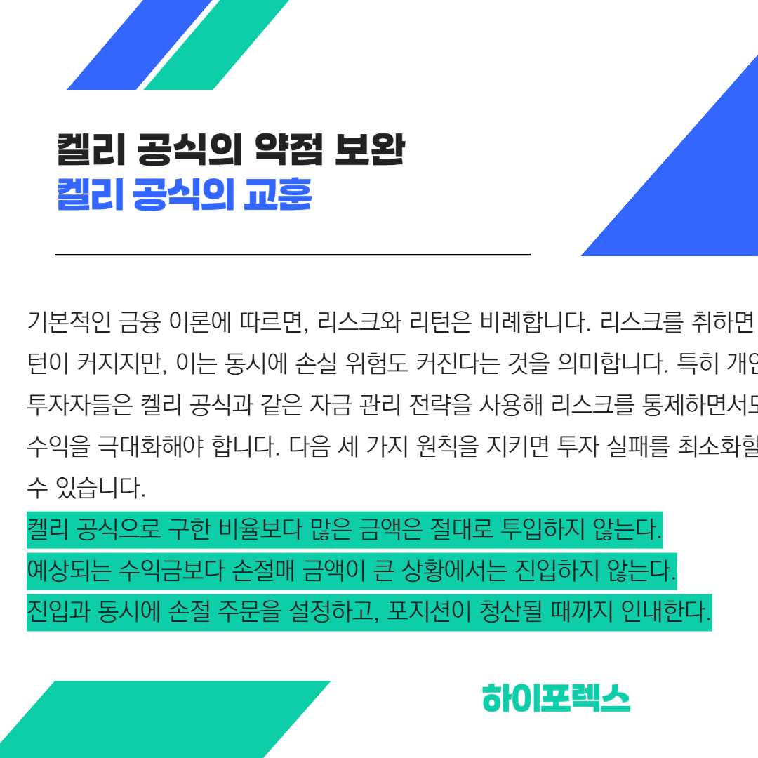 기본적인 금융 이론에 따르면, 리스크와 리턴은 비례합니다. 리스크를 취하면 리턴이 커지지만, 이는 동시에 손실 위험도 커진다는 것을 의미합니다. 특히 개인 투자자들은 켈리 공식과 같은 자금 관리 전략을 사용해 리스크를 통제하면서도 수익을 극대화해야 합니다. 다음 세 가지 원칙을 지키면 투자 실패를 최소화할 수 있습니다.