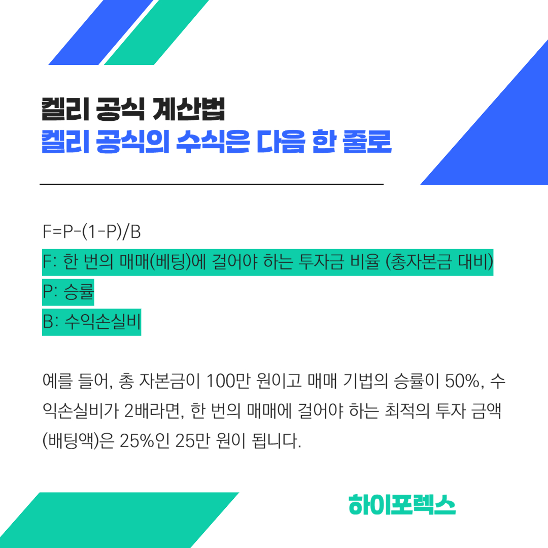 켈리 공식의 수식은 다음 한 줄로 간단히 정리됩니다.