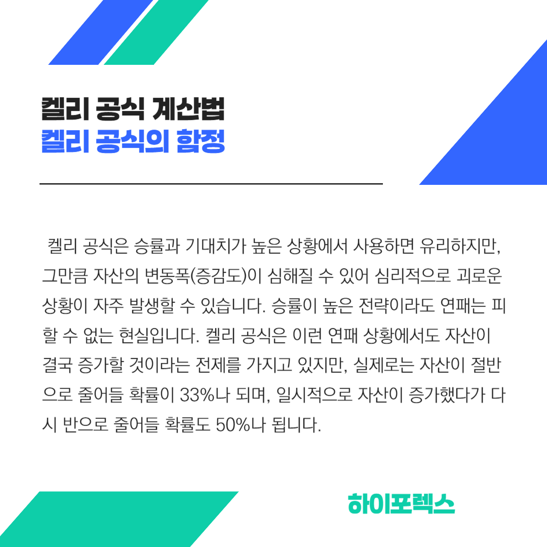 켈리 공식은 승률과 기대치가 높은 상황에서 사용하면 유리하지만, 그만큼 자산의 변동폭(증감도)이 심해질 수 있어 심리적으로 괴로운 상황이 자주 발생할 수 있습니다. 승률이 높은 전략이라도 연패는 피할 수 없는 현실입니다. 켈리 공식은 이런 연패 상황에서도 자산이 결국 증가할 것이라는 전제를 가지고 있지만, 실제로는 자산이 절반으로 줄어들 확률이 33%나 되며, 일시적으로 자산이 증가했다가 다시 반으로 줄어들 확률도 50%나 됩니다.