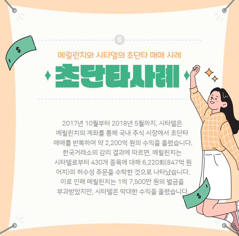 2017년 10월부터 2018년 5월까지, 시타델은 메릴린치의 계좌를 통해 국내 주식 시장에서 초단타 매매를 반복하며 약 2,200억 원의 수익을 올렸습니다. 한국거래소의 감리 결과에 따르면, 메릴린치는 시타델로부터 430개 종목에 대해 6,220회(847억 원어치)의 허수성 주문을 수탁한 것으로 나타났습니다. 이로 인해 메릴린치는 1억 7,500만 원의 벌금을 부과받았지만, 시타델은 막대한 수익을 올렸습니다.