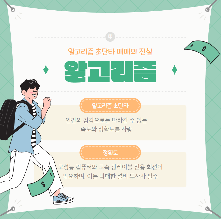 알고리즘 초단타 매매는 메릴린치와 시타델 같은 대형 퀀트펀드들이 사용하는 매매 방식으로, 인간의 감각으로는 따라갈 수 없는 속도와 정확도를 자랑합니다. 초단타 매매를 위해서는 고성능 컴퓨터와 고속 광케이블 전용 회선이 필요하며, 이는 막대한 설비 투자가 필수입니다. 따라서 개인 투자자가 접근하기는 어려운 영역입니다.