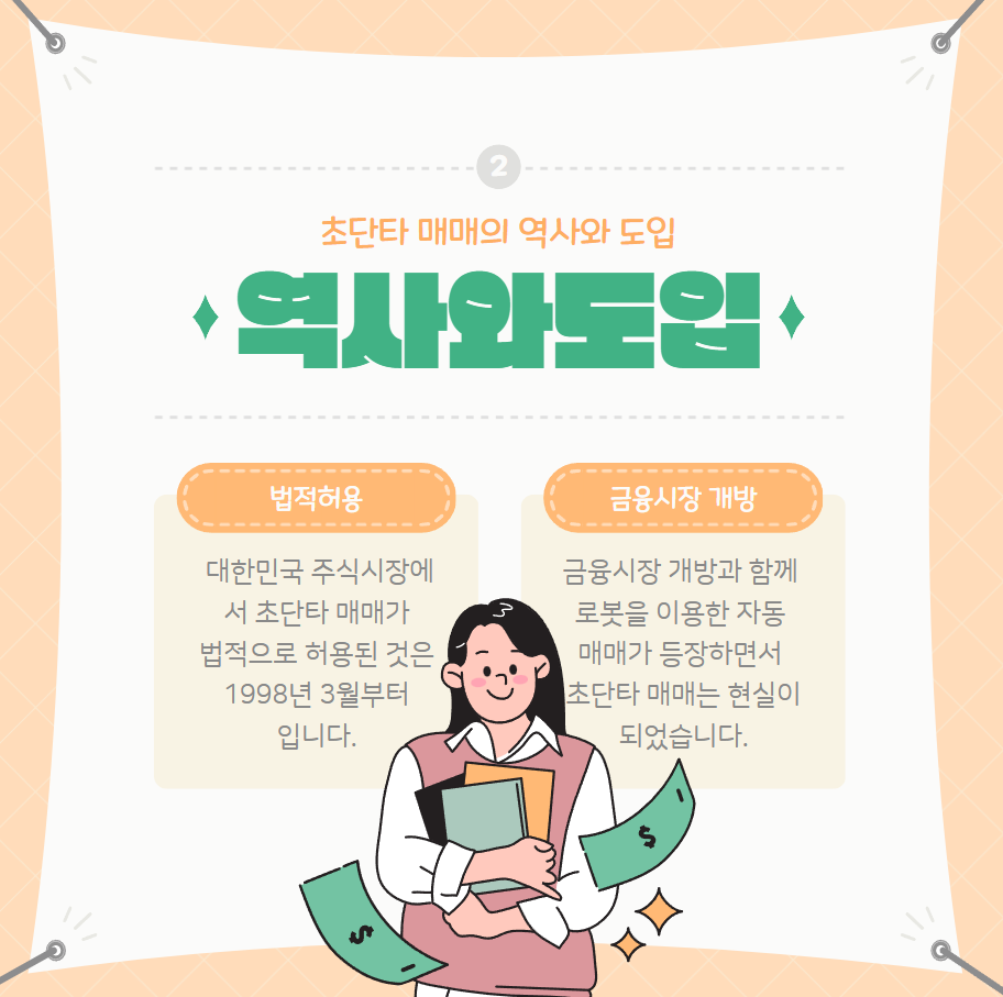 대한민국 주식시장에서 초단타 매매가 법적으로 허용된 것은 1998년 3월부터입니다. 그전까지는 매수와 매도가 하루 한 번만 허용되었기 때문에 초단타 매매라는 개념이 없었습니다. 그러나 금융시장 개방과 함께 로봇을 이용한 자동 매매가 등장하면서 초단타 매매는 현실이 되었습니다.