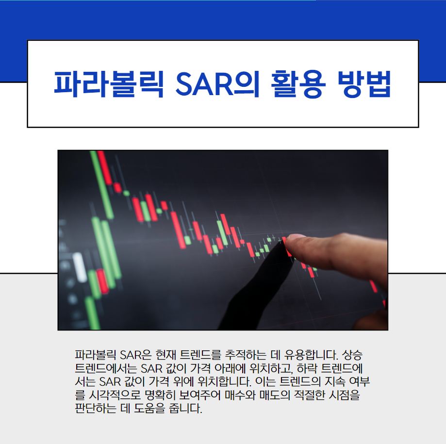 파라볼릭 SAR은 트렌드의 전환점을 예측하는 데 사용됩니다. 가격이 SAR 값을 돌파하면 매수 신호가 생성되고, 상승 트렌드에서 가격이 SAR 값을 하향 돌파하면 매도 신호로 해석됩니다. 이는 트렌드 추종 매매를 선호하는 투자자들에게 유용한 지표로, 시장의 방향성이 바뀔 때 빠르게 대응할 수 있도록 돕습니다.