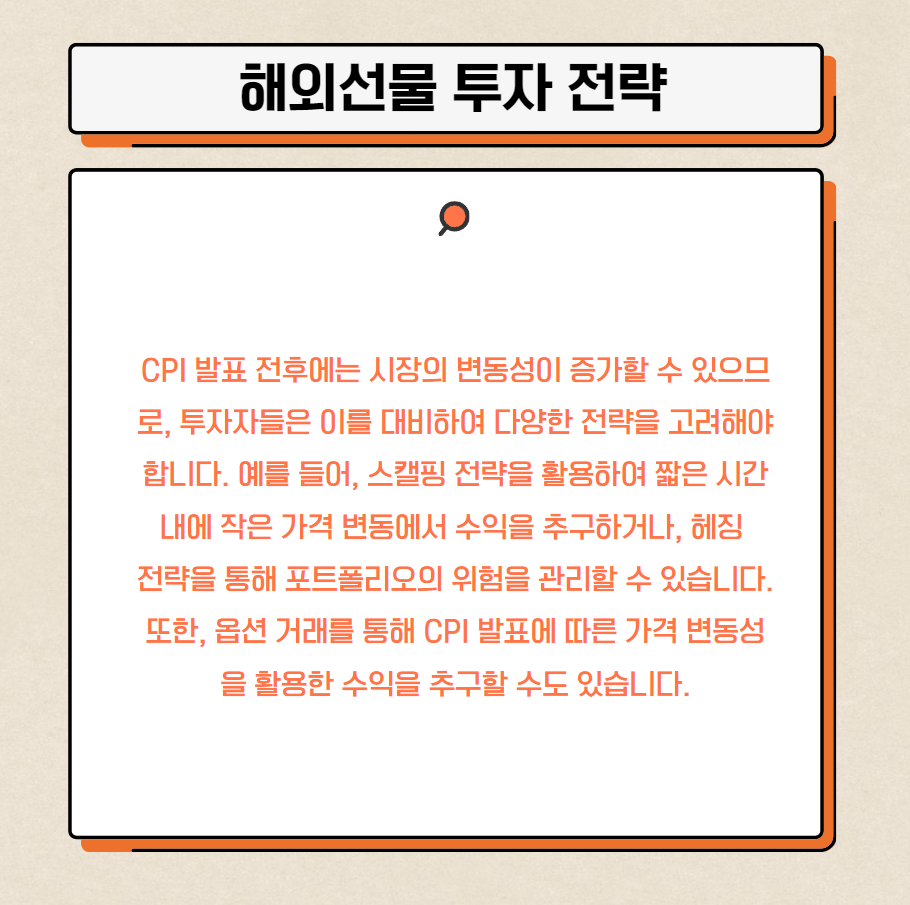 CPI 발표 전후에는 시장의 변동성이 증가할 수 있으므로, 투자자들은 이를 대비하여 다양한 전략을 고려해야 합니다. 예를 들어, 스캘핑 전략을 활용하여 짧은 시간 내에 작은 가격 변동에서 수익을 추구하거나, 헤징 전략을 통해 포트폴리오의 위험을 관리할 수 있습니다. 또한, 옵션 거래를 통해 CPI 발표에 따른 가격 변동성을 활용한 수익을 추구할 수도 있습니다.