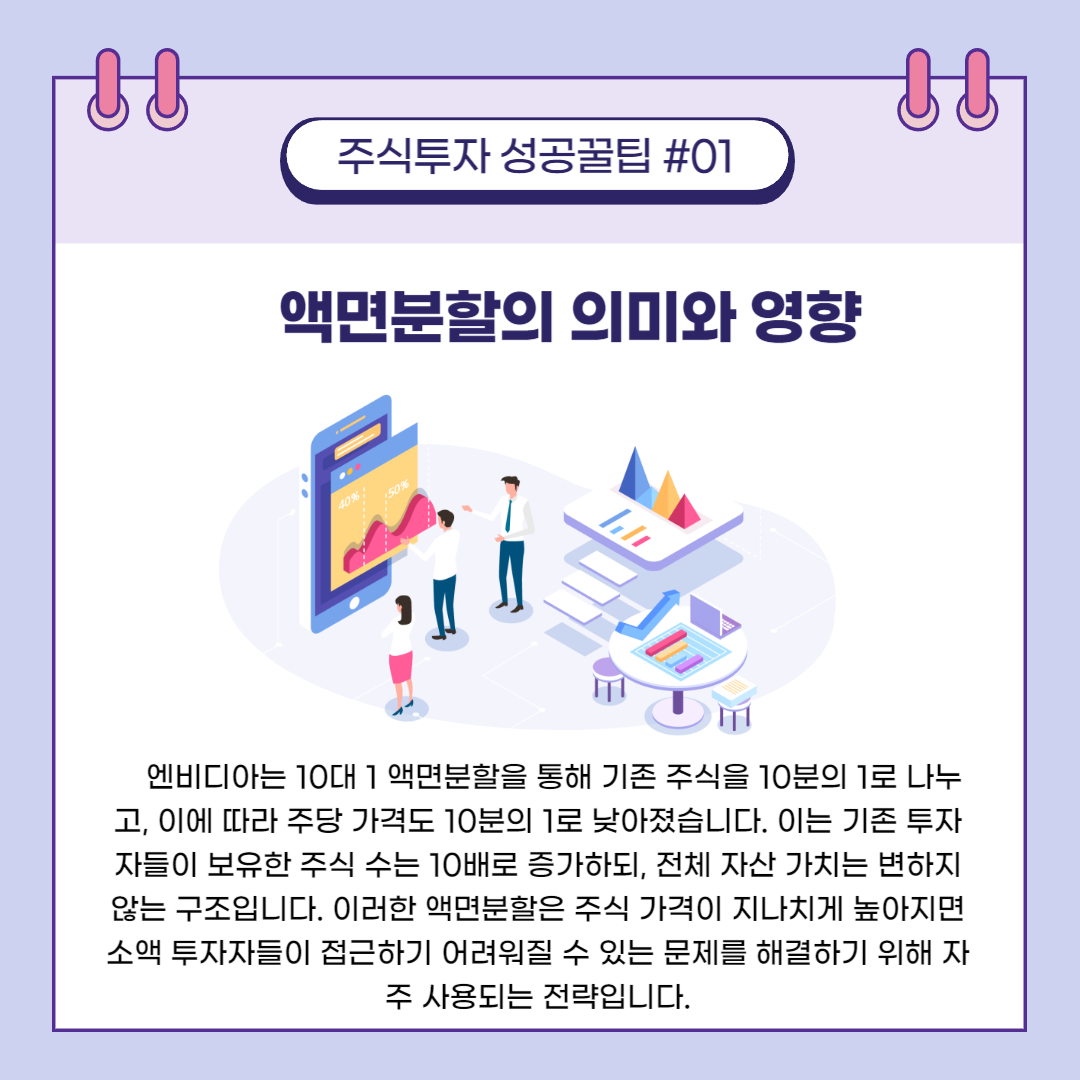 엔비디아는 10대 1 액면분할을 통해 기존 주식을 10분의 1로 나누고, 이에 따라 주당 가격도 10분의 1로 낮아졌습니다. 이는 기존 투자자들이 보유한 주식 수는 10배로 증가하되, 전체 자산 가치는 변하지 않는 구조입니다. 이러한 액면분할은 주식 가격이 지나치게 높아지면 소액 투자자들이 접근하기 어려워질 수 있는 문제를 해결하기 위해 자주 사용되는 전략입니다.
