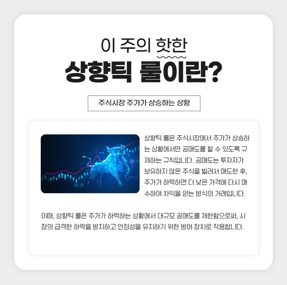 상향틱 룰은 주식시장에서 주가가 상승하는 상황에서만 공매도를 할 수 있도록 규제하는 규칙입니다. 공매도는 투자자가 보유하지 않은 주식을 빌려서 매도한 후, 주가가 하락하면 더 낮은 가격에 다시 매수하여 차익을 얻는 방식의 거래입니다. 이때, 상향틱 룰은 주가가 하락하는 상황에서 대규모 공매도를 제한함으로써, 시장의 급격한 하락을 방지하고 안정성을 유지하기 위한 방어 장치로 작용합니다.