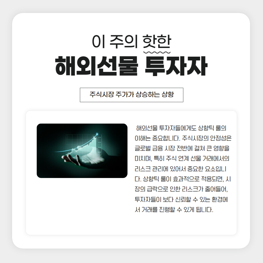 해외선물 투자자들에게도 상향틱 룰의 이해는 중요합니다. 주식시장의 안정성은 글로벌 금융 시장 전반에 걸쳐 큰 영향을 미치며, 특히 주식 연계 선물 거래에서의 리스크 관리에 있어서 중요한 요소입니다. 상향틱 룰이 효과적으로 적용되면, 시장의 급락으로 인한 리스크가 줄어들어, 투자자들이 보다 신뢰할 수 있는 환경에서 거래를 진행할 수 있게 됩니다.