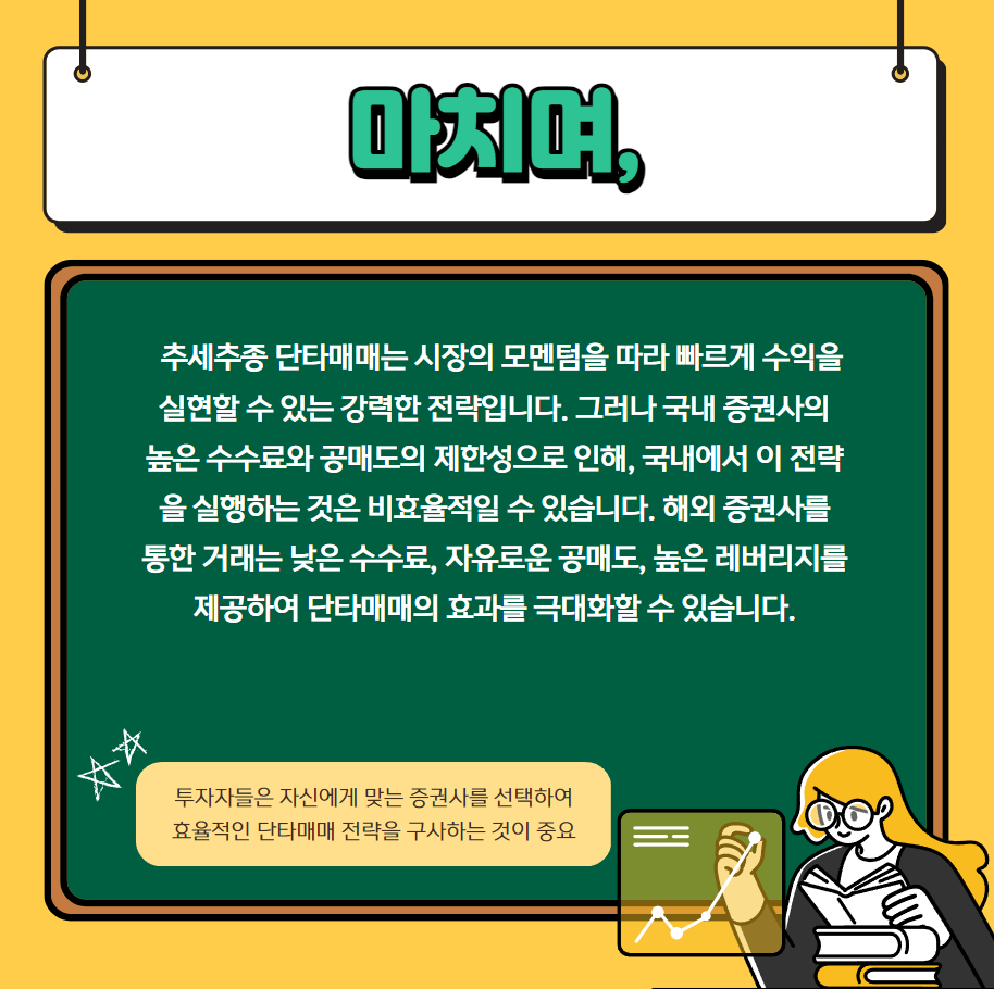 추세추종 단타매매는 시장의 모멘텀을 따라 빠르게 수익을 실현할 수 있는 강력한 전략입니다. 그러나 국내 증권사의 높은 수수료와 공매도의 제한성으로 인해, 국내에서 이 전략을 실행하는 것은 비효율적일 수 있습니다. 해외 증권사를 통한 거래는 낮은 수수료, 자유로운 공매도, 높은 레버리지를 제공하여 단타매매의 효과를 극대화할 수 있습니다.