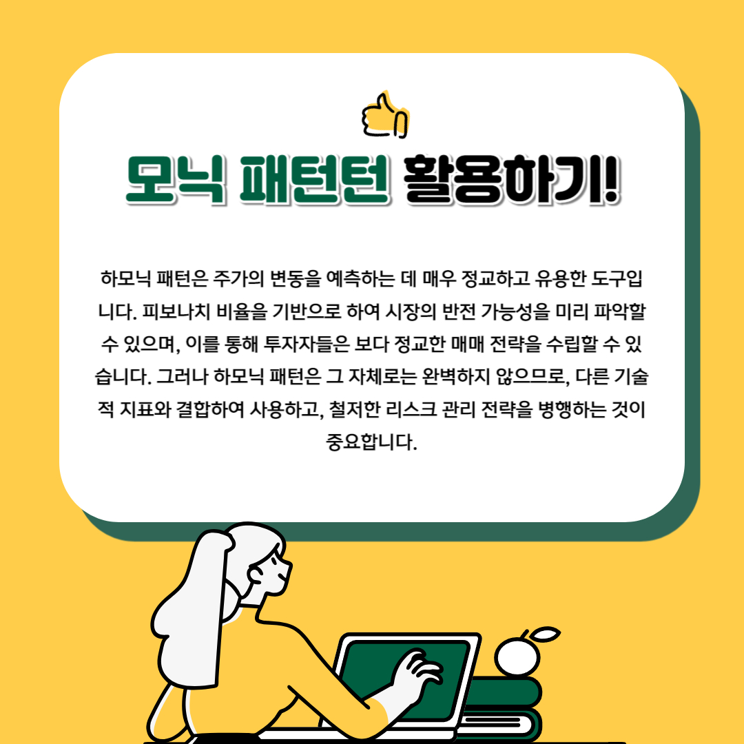 하모닉 패턴은 주가의 변동을 예측하는 데 매우 정교하고 유용한 도구입니다. 피보나치 비율을 기반으로 하여 시장의 반전 가능성을 미리 파악할 수 있으며, 이를 통해 투자자들은 보다 정교한 매매 전략을 수립할 수 있습니다. 그러나 하모닉 패턴은 그 자체로는 완벽하지 않으므로, 다른 기술적 지표와 결합하여 사용하고, 철저한 리스크 관리 전략을 병행하는 것이 중요합니다.