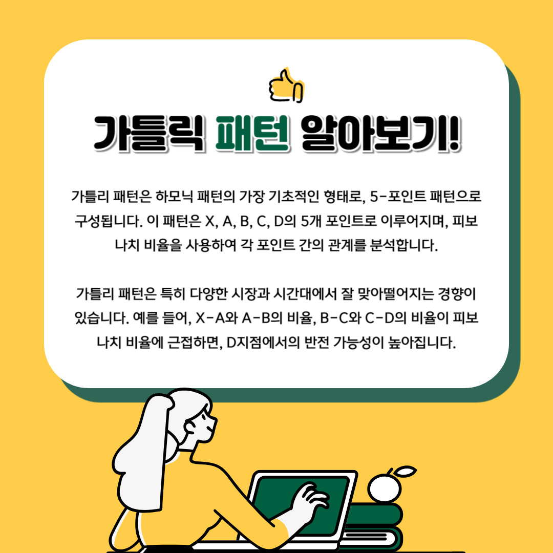 가틀리 패턴은 하모닉 패턴의 가장 기초적인 형태로, 5-포인트 패턴으로 구성됩니다. 이 패턴은 X, A, B, C, D의 5개 포인트로 이루어지며, 피보나치 비율을 사용하여 각 포인트 간의 관계를 분석합니다.
