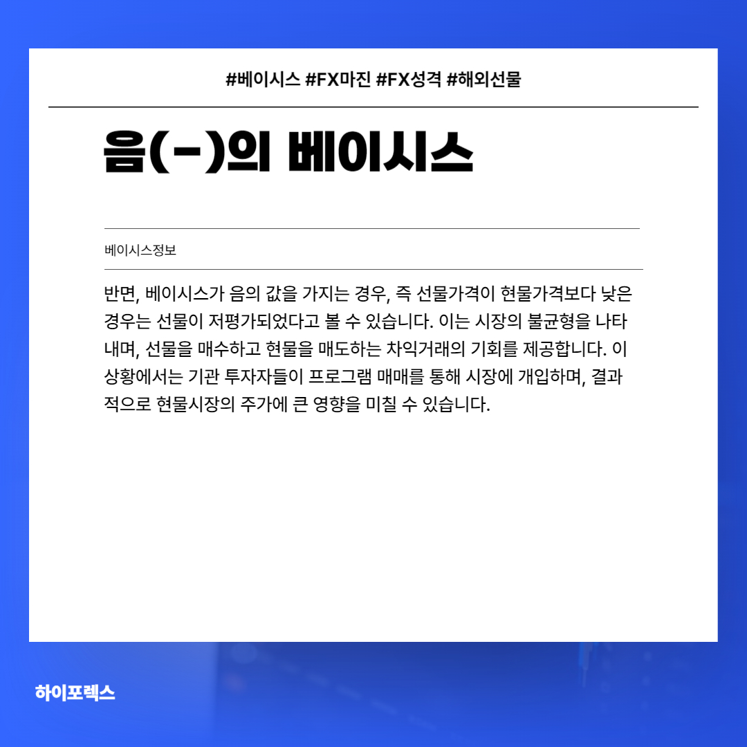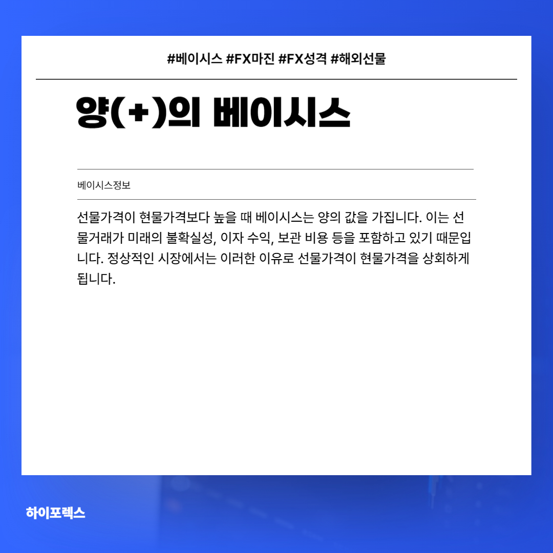 선물가격이 현물가격보다 높을 때 베이시스는 양의 값을 가집니다. 이는 선물거래가 미래의 불확실성, 이자 수익, 보관 비용 등을 포함하고 있기 때문입니다. 정상적인 시장에서는 이러한 이유로 선물가격이 현물가격을 상회하게 됩니다.