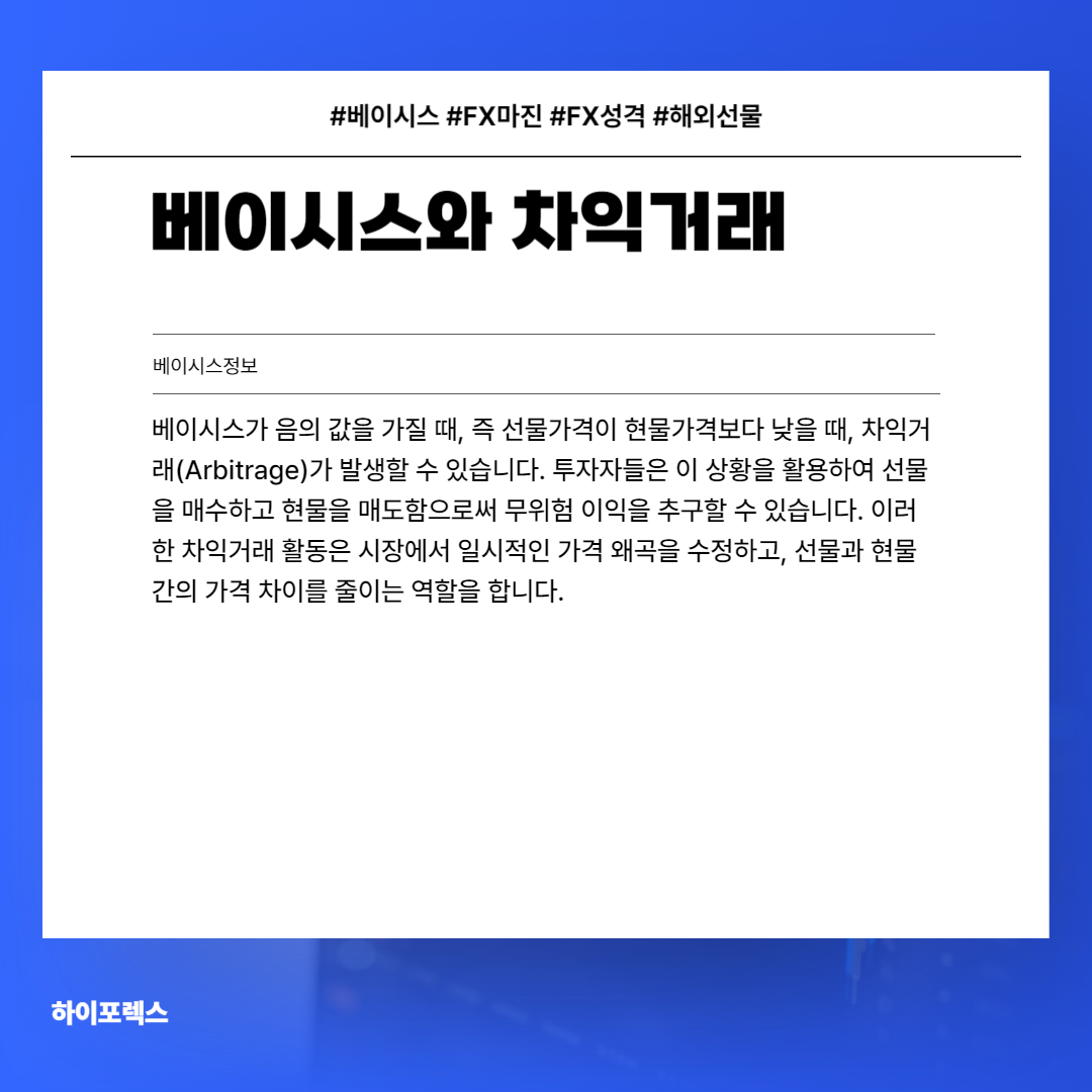 베이시스는 선물가격과 현물가격 간의 차이를 이해하고, 이를 바탕으로 시장을 분석하는 데 중요한 역할을 하는 지표입니다. 양의 베이시스는 선물가격이 현물가격보다 높다는 것을, 음의 베이시스는 그 반대를 의미하며, 이러한 상황에 따라 차익거래와 같은 전략을 통해 시장 기회를 포착할 수 있습니다.