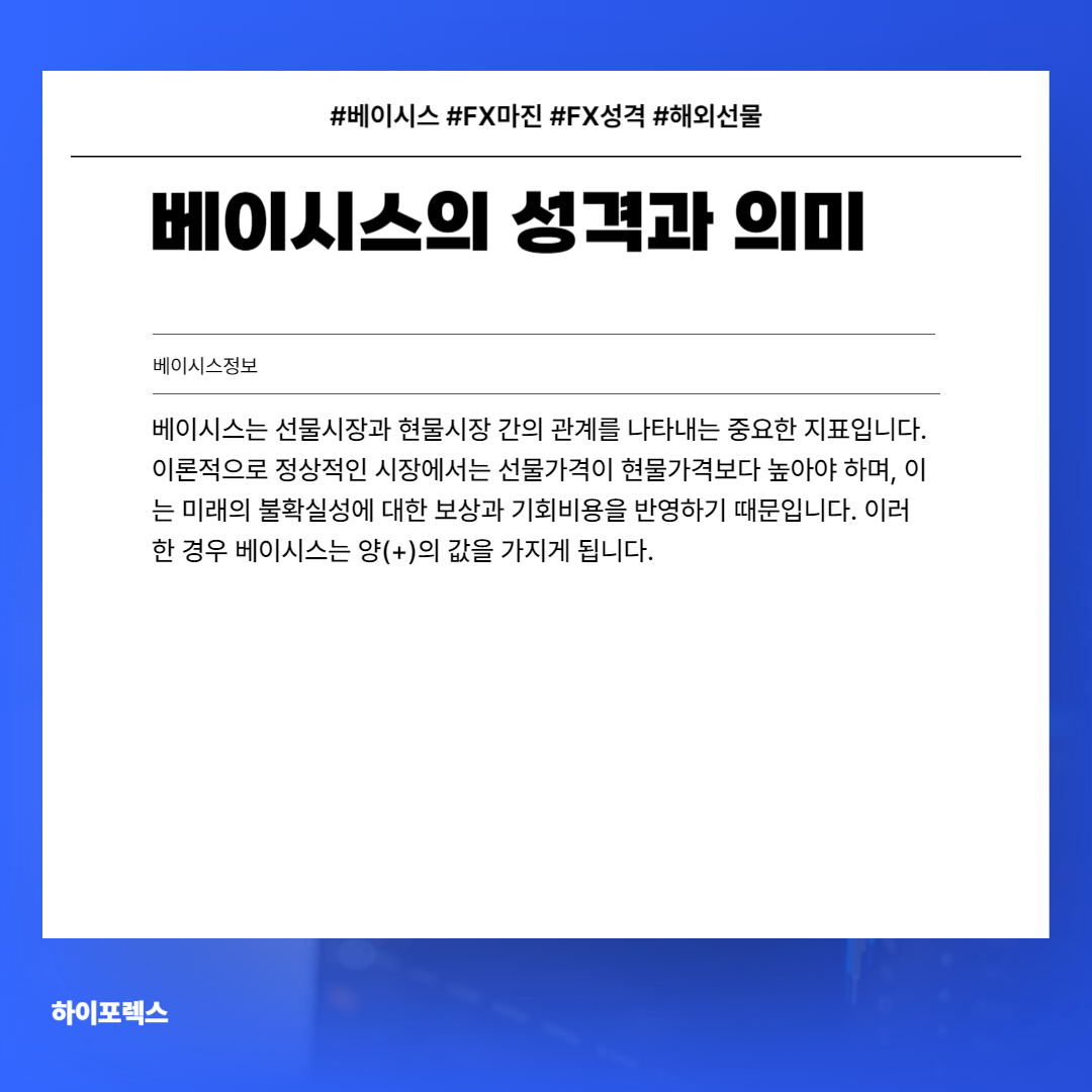 베이시스는 선물시장과 현물시장 간의 관계를 나타내는 중요한 지표입니다. 이론적으로 정상적인 시장에서는 선물가격이 현물가격보다 높아야 하며, 이는 미래의 불확실성에 대한 보상과 기회비용을 반영하기 때문입니다. 이러한 경우 베이시스는 양(+)의 값을 가지게 됩니다.