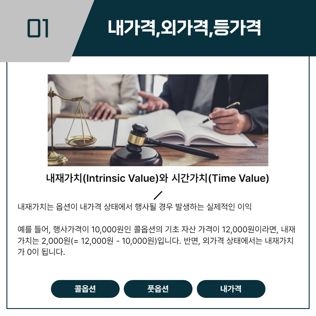 - 내가격 옵션(ITM)의 경우 내재가치가 존재하며, 이 내재가치에 시간가치가 더해진 금액이 옵션의 전체 가치가 됩니다.