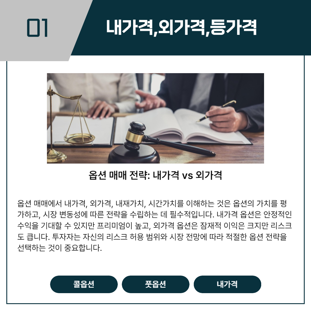 옵션 거래는 투자자들에게 주식, 선물 등 다양한 기초 자산을 대상으로 높은 잠재 수익을 제공하는 전략적 도구입니다. 이 과정에서 내가격(ITM, In The Money), 외가격(OTM, Out of The Money), 등가격(ATM, At The Money)과 같은 용어는 옵션의 현재 상태와 잠재적 가치를 이해하는 데 중요한 역할을 합니다. 이 글에서는 옵션의 내가격과 외가격을 계산하는 방법과 내재가치의 의미에 대해 자세히 살펴보겠습니다.