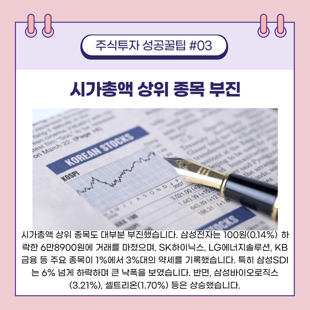 시가총액 상위 종목도 대부분 부진했습니다. 삼성전자는 100원(0.14%) 하락한 6만8900원에 거래를 마쳤으며, SK하이닉스, LG에너지솔루션, KB금융 등 주요 종목이 1%에서 3%대의 약세를 기록했습니다. 특히 삼성SDI는 6% 넘게 하락하며 큰 낙폭을 보였습니다. 반면, 삼성바이오로직스(3.21%), 셀트리온(1.70%) 등은 상승했습니다.