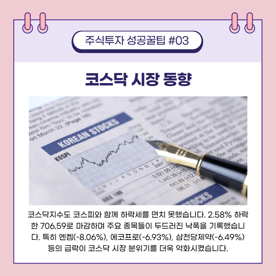 코스닥지수도 코스피와 함께 하락세를 면치 못했습니다. 2.58% 하락한 706.59로 마감하며 주요 종목들이 두드러진 낙폭을 기록했습니다. 특히 엔켐(-8.06%), 에코프로(-6.93%), 삼천당제약(-6.49%) 등의 급락이 코스닥 시장 분위기를 더욱 악화시켰습니다.