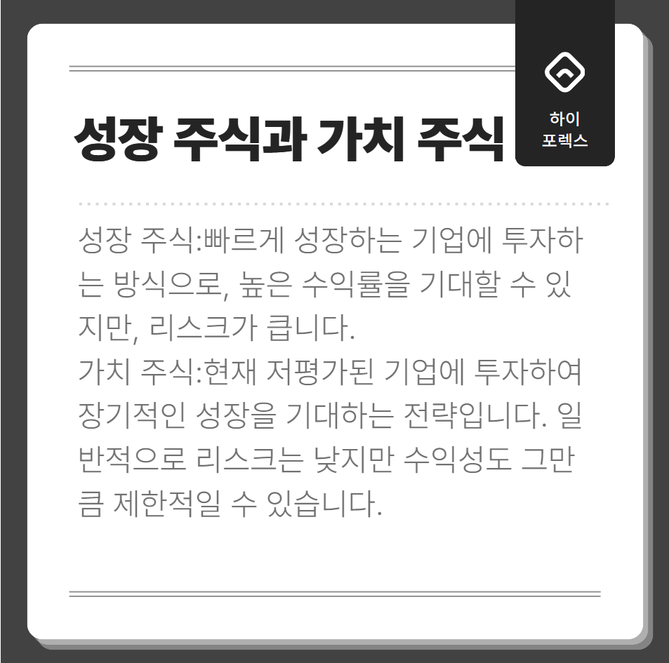 - 성장 주식: 빠르게 성장하는 기업에 투자하는 방식으로, 높은 수익률을 기대할 수 있지만, 리스크가 큽니다.