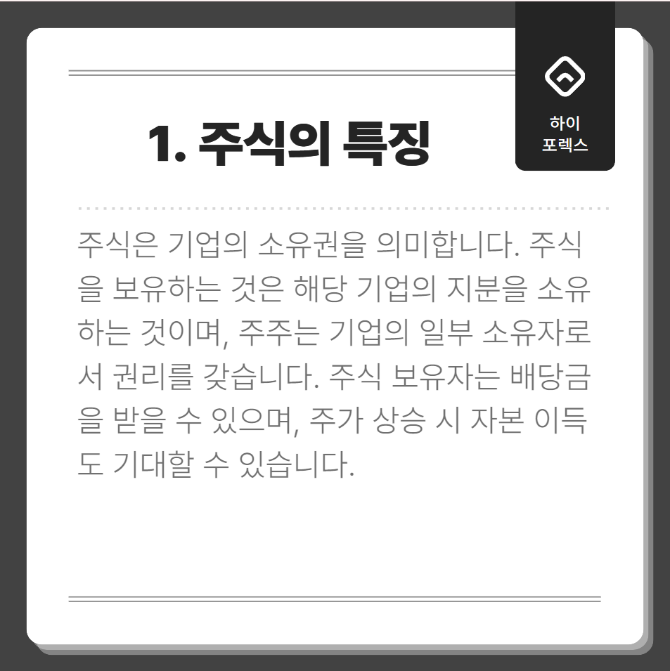 주식은 기업의 소유권을 의미합니다. 주식을 보유하는 것은 해당 기업의 지분을 소유하는 것이며, 주주는 기업의 일부 소유자로서 권리를 갖습니다. 주식 보유자는 배당금을 받을 수 있으며, 주가 상승 시 자본 이득도 기대할 수 있습니다.