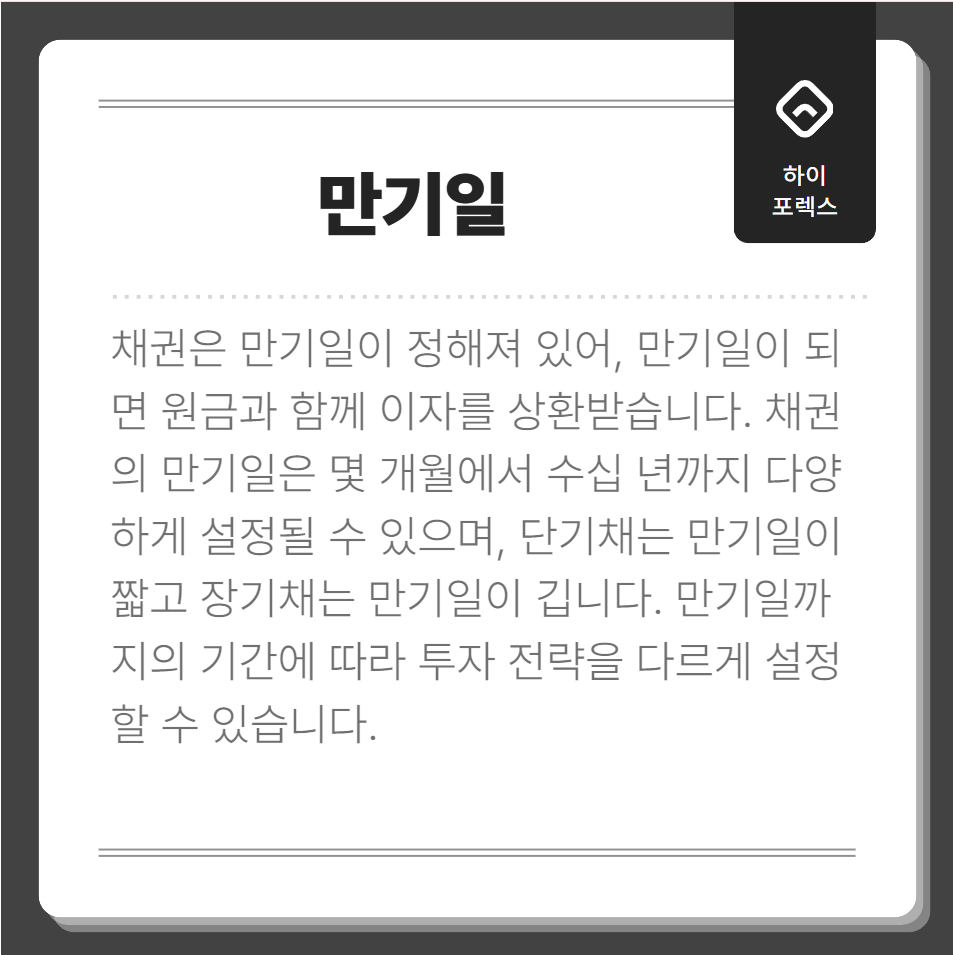 채권은 만기일이 정해져 있어, 만기일이 되면 원금과 함께 이자를 상환받습니다. 채권의 만기일은 몇 개월에서 수십 년까지 다양하게 설정될 수 있으며, 단기채는 만기일이 짧고 장기채는 만기일이 깁니다. 만기일까지의 기간에 따라 투자 전략을 다르게 설정할 수 있습니다.
