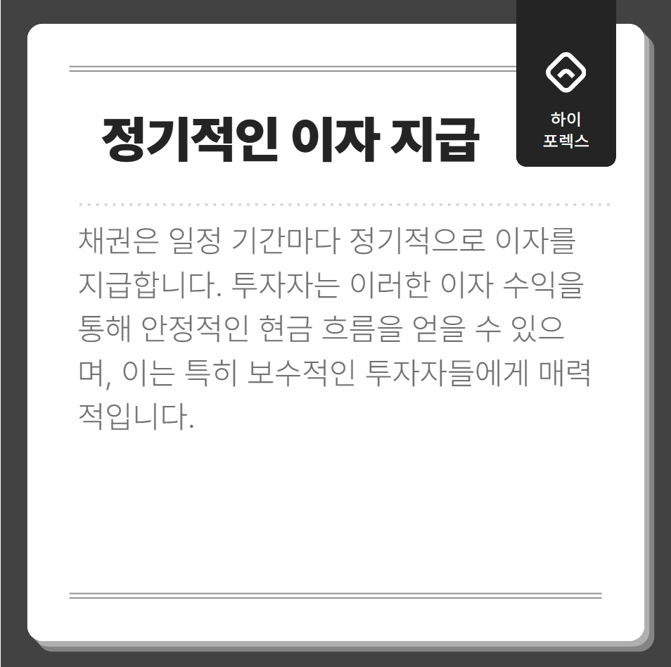 채권은 일정 기간마다 정기적으로 이자를 지급합니다. 투자자는 이러한 이자 수익을 통해 안정적인 현금 흐름을 얻을 수 있으며, 이는 특히 보수적인 투자자들에게 매력적입니다.