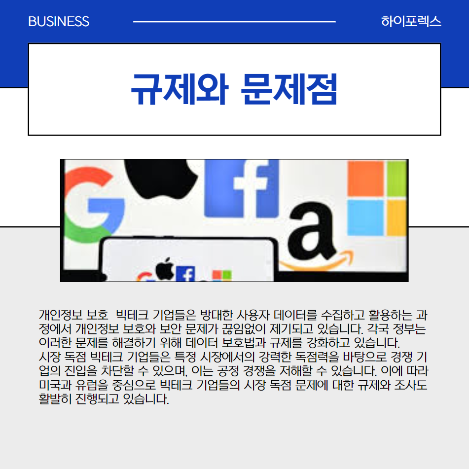 빅테크 기업들의 빠른 성장과 확장은 다양한 문제점을 초래하기도 했습니다. 이들은 막대한 데이터와 자원을 보유하고 있으며, 이로 인해 개인정보 보호와 시장 독점에 대한 우려가 커지고 있습니다.