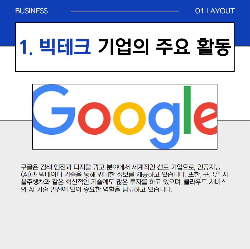 구글은 검색 엔진과 디지털 광고 분야에서 세계적인 선도 기업으로, 인공지능(AI)과 빅데이터 기술을 통해 방대한 정보를 제공하고 있습니다. 또한, 구글은 자율주행차와 같은 혁신적인 기술에도 많은 투자를 하고 있으며, 클라우드 서비스와 AI 기술 발전에 있어 중요한 역할을 담당하고 있습니다.