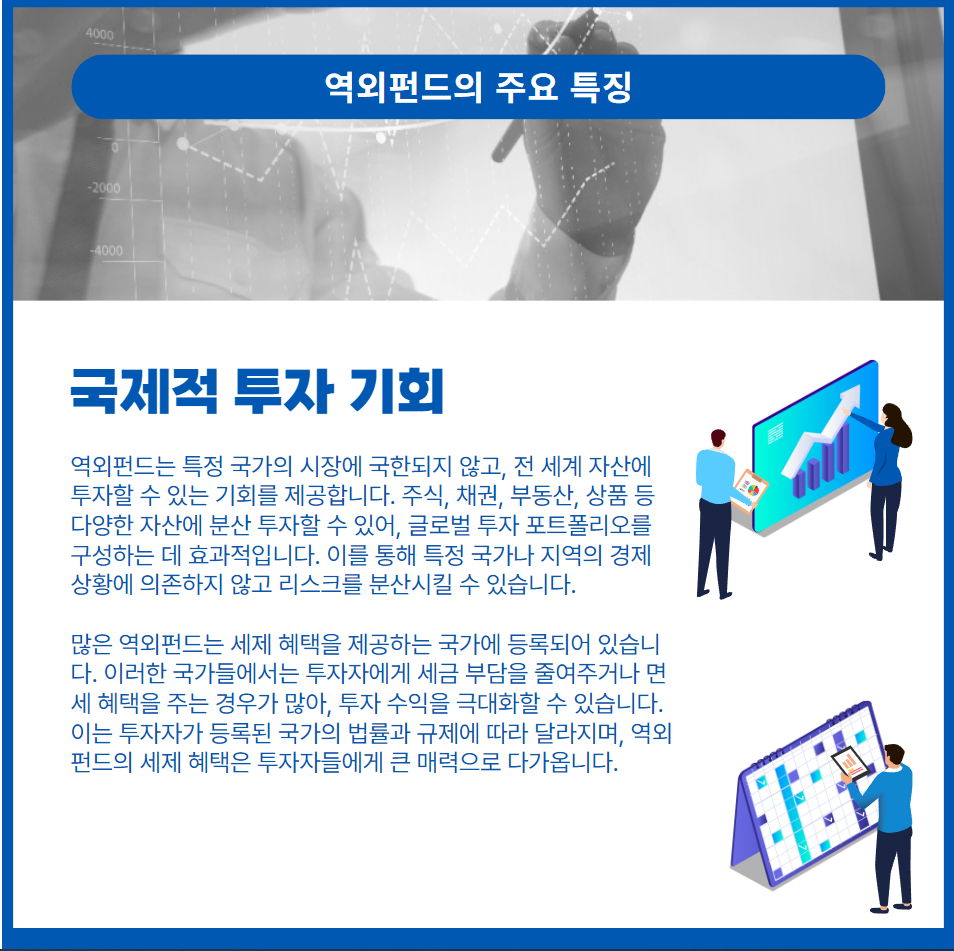 역외펀드는 특정 국가의 시장에 국한되지 않고, 전 세계 자산에 투자할 수 있는 기회를 제공합니다. 주식, 채권, 부동산, 상품 등 다양한 자산에 분산 투자할 수 있어, 글로벌 투자 포트폴리오를 구성하는 데 효과적입니다. 이를 통해 특정 국가나 지역의 경제 상황에 의존하지 않고 리스크를 분산시킬 수 있습니다.