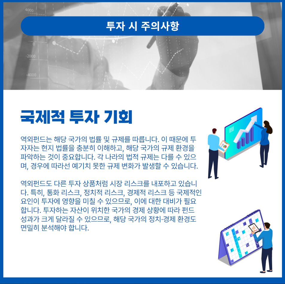 역외펀드도 다른 투자 상품처럼 시장 리스크를 내포하고 있습니다. 특히, 통화 리스크, 정치적 리스크, 경제적 리스크 등 국제적인 요인이 투자에 영향을 미칠 수 있으므로, 이에 대한 대비가 필요합니다. 투자하는 자산이 위치한 국가의 경제 상황에 따라 펀드 성과가 크게 달라질 수 있으므로, 해당 국가의 정치·경제 환경도 면밀히 분석해야 합니다.