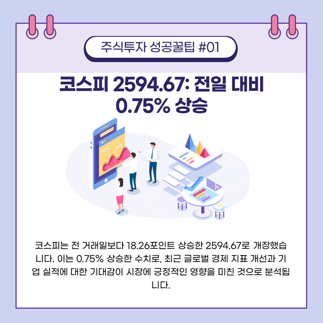 코스피는 전 거래일보다 18.26포인트 상승한 2594.67로 개장했습니다. 이는 0.75% 상승한 수치로, 최근 글로벌 경제 지표 개선과 기업 실적에 대한 기대감이 시장에 긍정적인 영향을 미친 것으로 분석됩니다.
