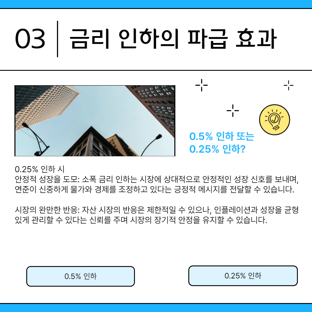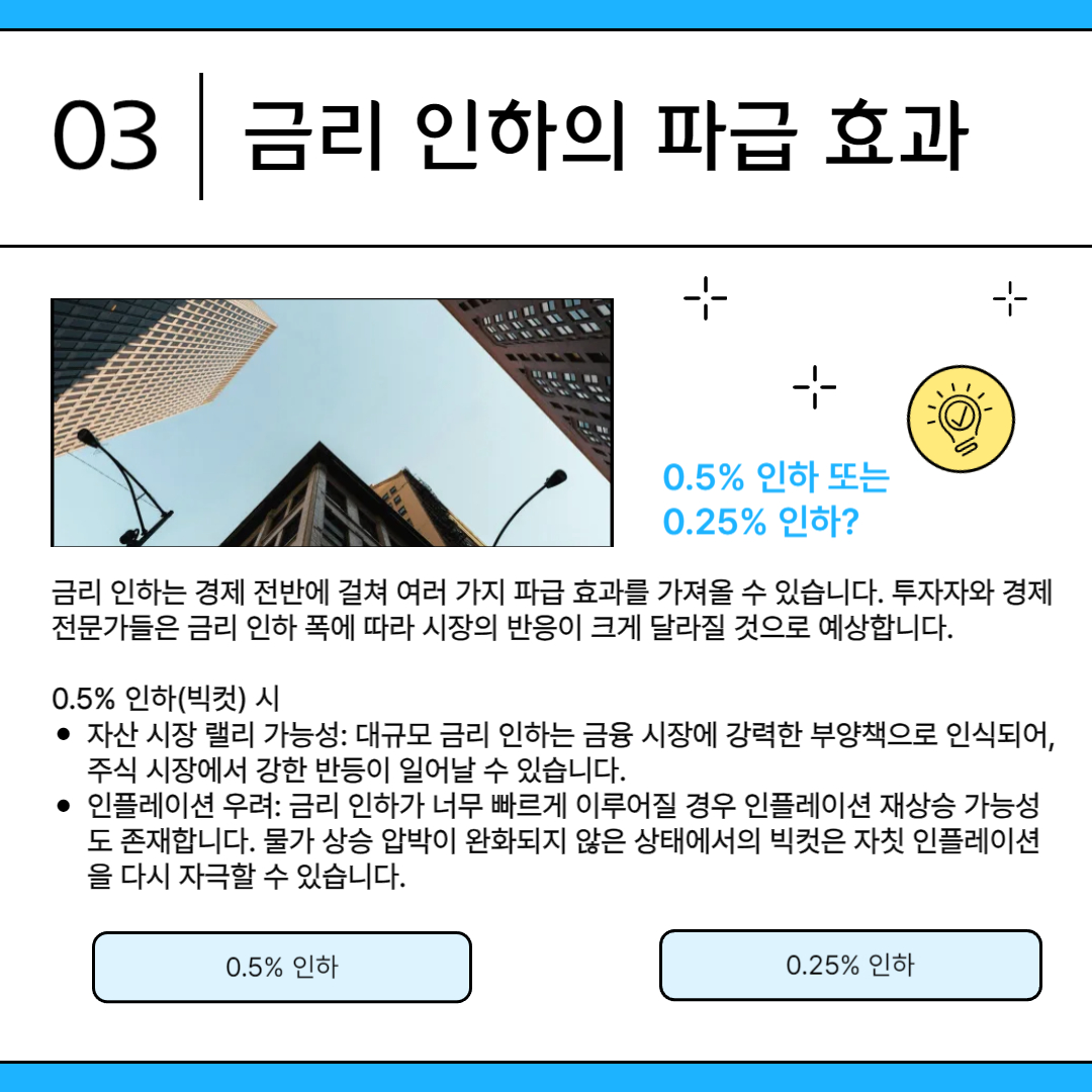 금리 인하는 경제 전반에 걸쳐 여러 가지 파급 효과를 가져올 수 있습니다. 투자자와 경제 전문가들은 금리 인하 폭에 따라 시장의 반응이 크게 달라질 것으로 예상합니다.