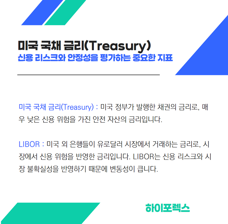 - 미국 국채 금리(Treasury): 미국 정부가 발행한 채권의 금리로, 매우 낮은 신용 위험을 가진 안전 자산의 금리입니다.