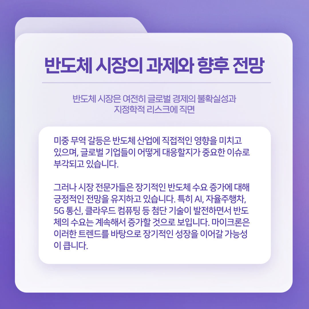 그러나 시장 전문가들은 장기적인 반도체 수요 증가에 대해 긍정적인 전망을 유지하고 있습니다. 특히 AI, 자율주행차, 5G 통신, 클라우드 컴퓨팅 등 첨단 기술이 발전하면서 반도체의 수요는 계속해서 증가할 것으로 보입니다. 마이크론은 이러한 트렌드를 바탕으로 장기적인 성장을 이어갈 가능성이 큽니다.